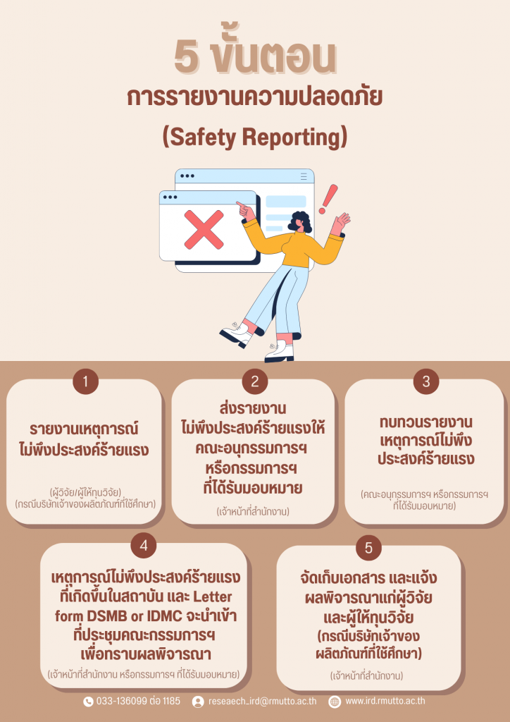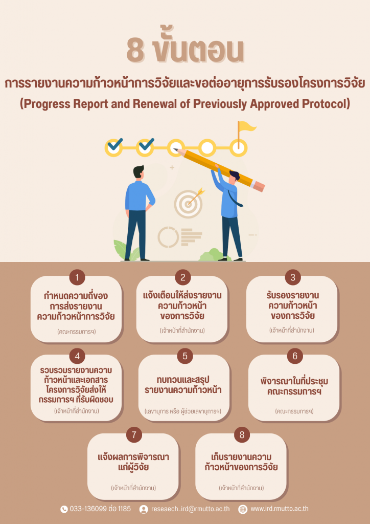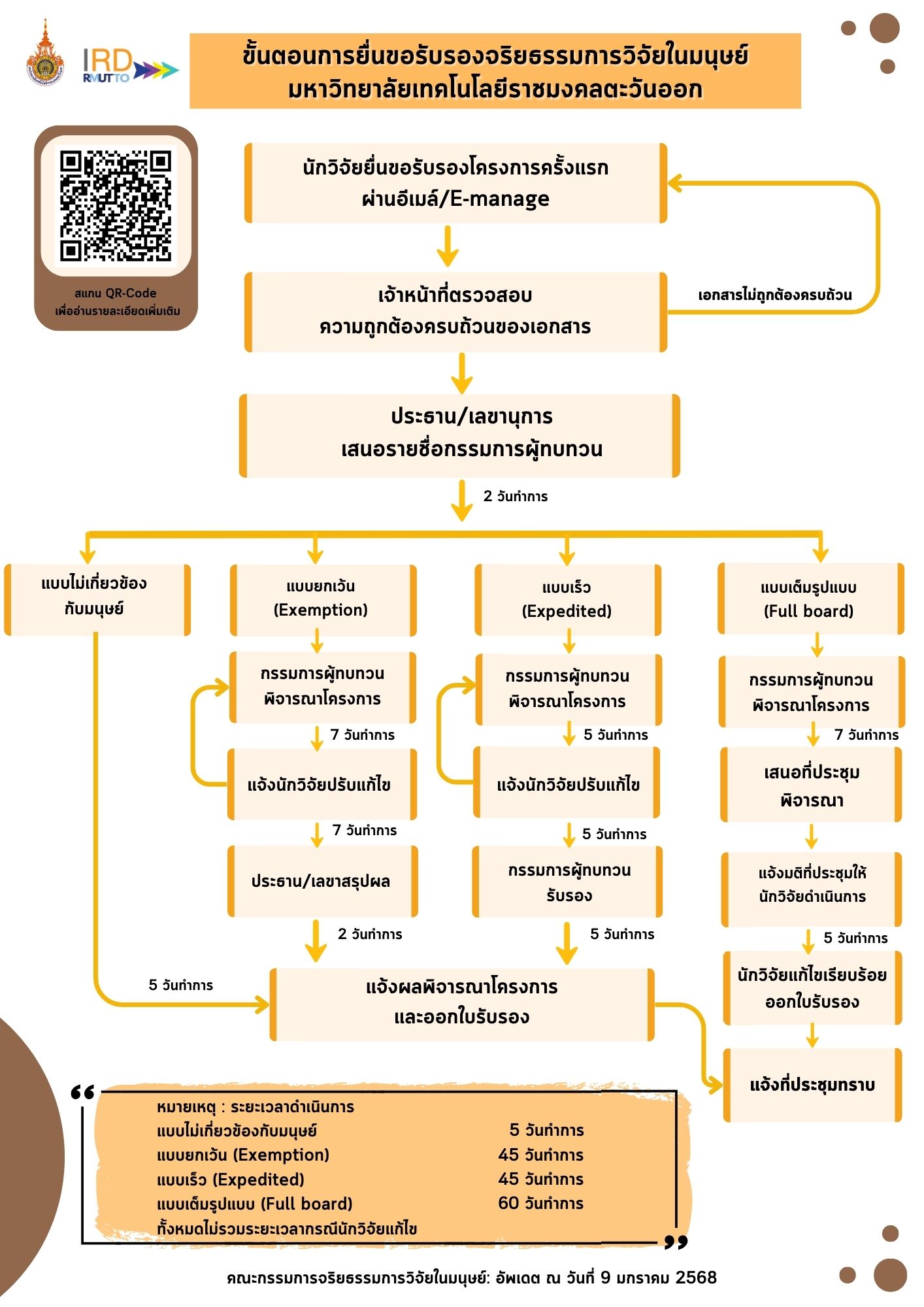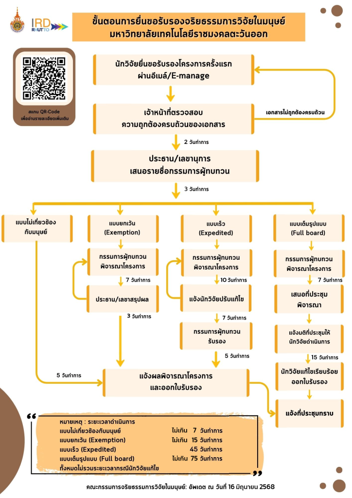ขั้นตอนการยื่นขอรับรองจริยธรรมการวิจัยในมนุษย์ ขั้นตอนการรายงานส่วนแก้ไขเพิ่มเติมโครงการวิจัย ขั้นตอนรายงานความก้าวหน้าการวิจัยและขอต่ออายุการรับรองโครงการ ขั้นตอนการรายงานการเบี่ยงเบนหรือไม่ปฏิบัติตามโครงการวิจัยที่ได้รับการรับรอง ขั้นตอนการรายงานความปลอดภัย ขั้นตอนการรายงานสรุปผลการวิจัย ขั้นตอนการรายงานการยุติโครงการวิจัยก่อนกำหนด ขั้นตอนการรายงานเรื่องร้องเรียนเกี่ยวกับโครงการ