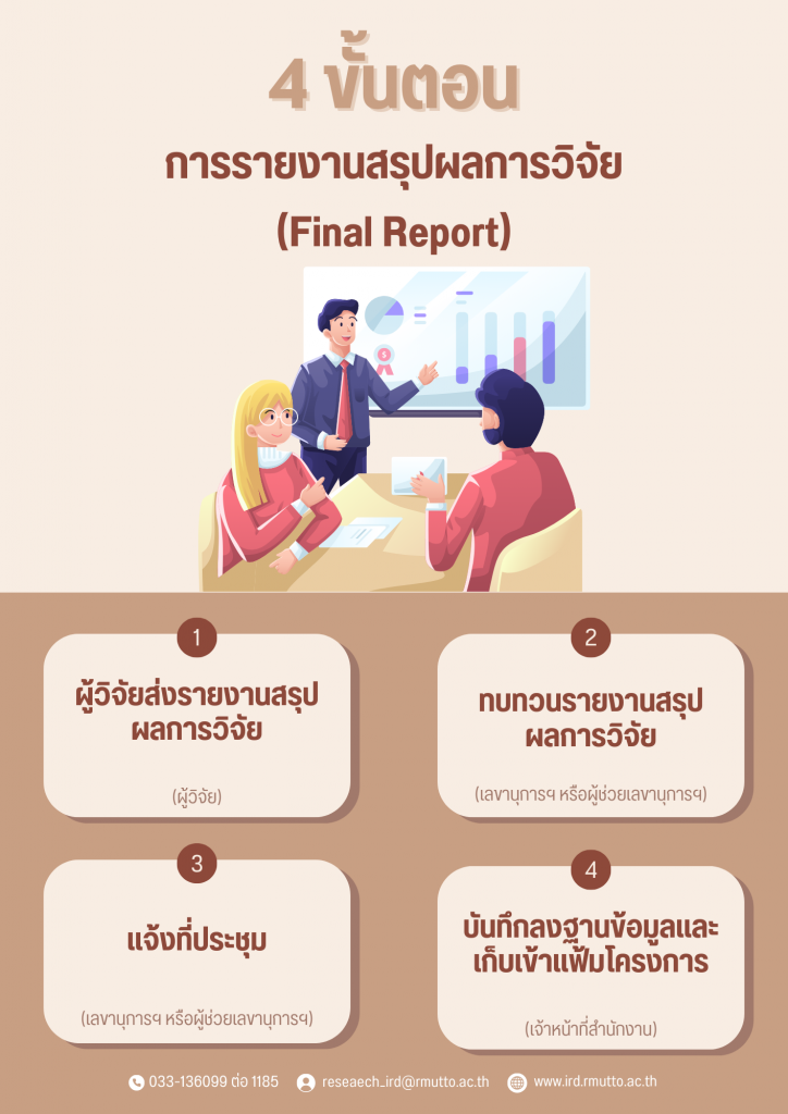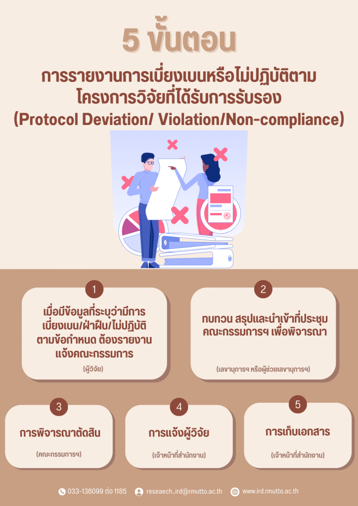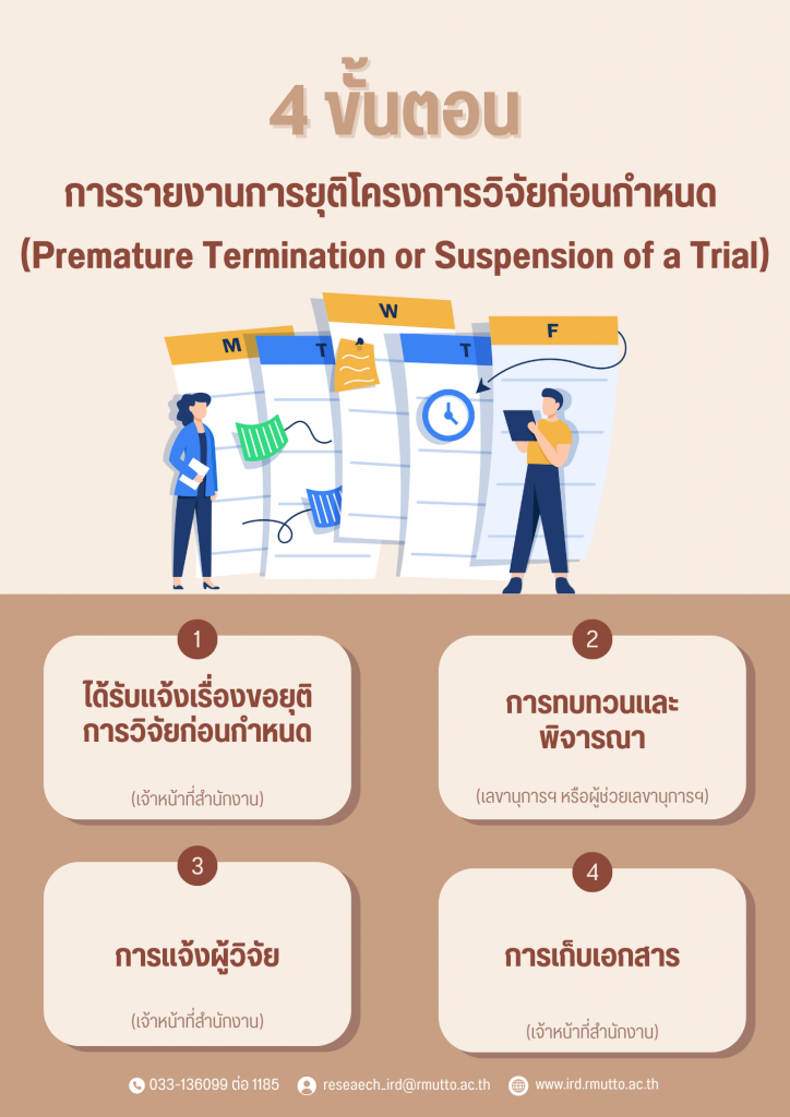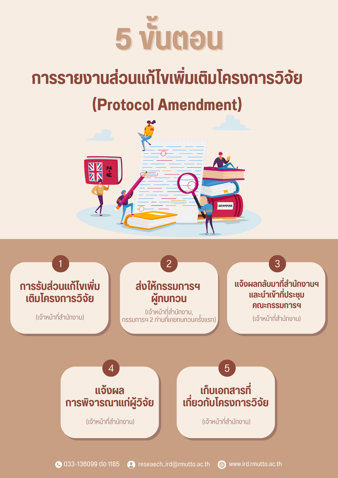 ขั้นตอนการยื่นขอรับรองจริยธรรมการวิจัยในมนุษย์ ขั้นตอนการรายงานส่วนแก้ไขเพิ่มเติมโครงการวิจัย ขั้นตอนรายงานความก้าวหน้าการวิจัยและขอต่ออายุการรับรองโครงการ ขั้นตอนการรายงานการเบี่ยงเบนหรือไม่ปฏิบัติตามโครงการวิจัยที่ได้รับการรับรอง ขั้นตอนการรายงานความปลอดภัย ขั้นตอนการรายงานสรุปผลการวิจัย ขั้นตอนการรายงานการยุติโครงการวิจัยก่อนกำหนด ขั้นตอนการรายงานเรื่องร้องเรียนเกี่ยวกับโครงการ