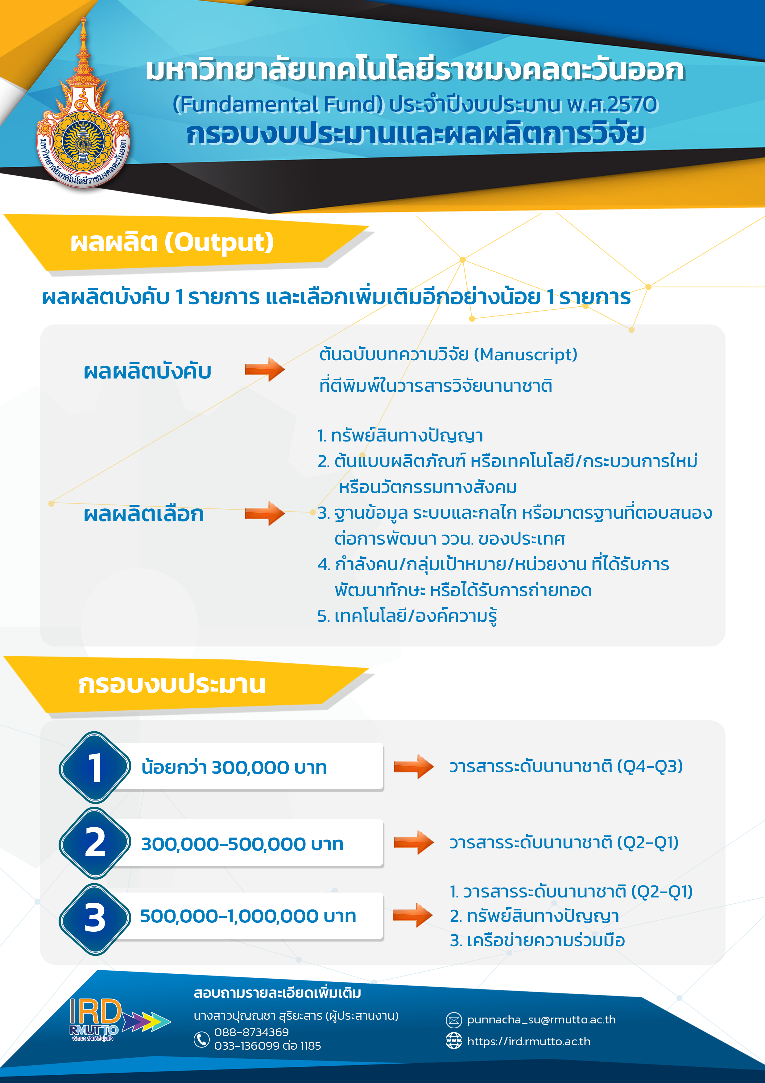 สถาบันวิจัยและพัฒนา เปิดรับข้อเสนอโครงการวิจัย (Full Proposal) เพื่อเสนอขอรับการสนับสนุนงบประมาณ (Fundamental Fund: FF) พ.ศ.2570 เพื่อพิจารณากลั่นกรองและเสนอของบประมาณไปยังแหล่งทุน โดยมีรายละเอียดดังนี้