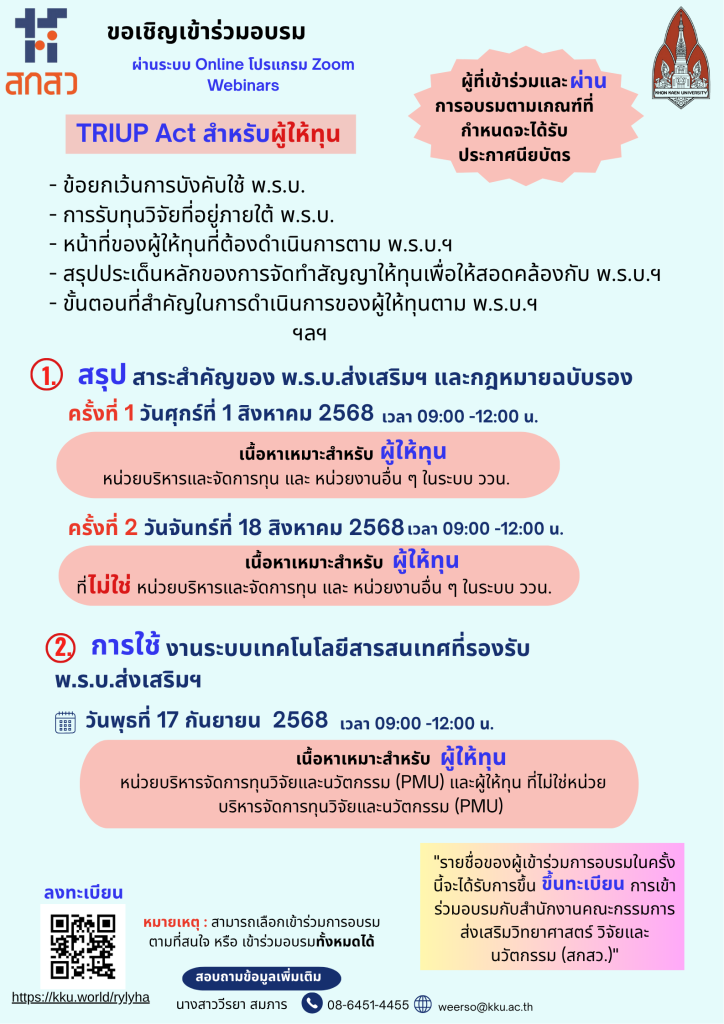 สำนักงานคณะกรรมการส่งเสริมวิทยาศาสตร์ วิจัยและนวัตกรรม (สกสว.) ร่วมกับ มหาวิทยาลัยขอนแก่น กำหนดจัดการอบรม ผ่านระบบ Online โปรแกรม Zoom Webinars เนื้อหาเหมาะสำหรับผู้รับทุน