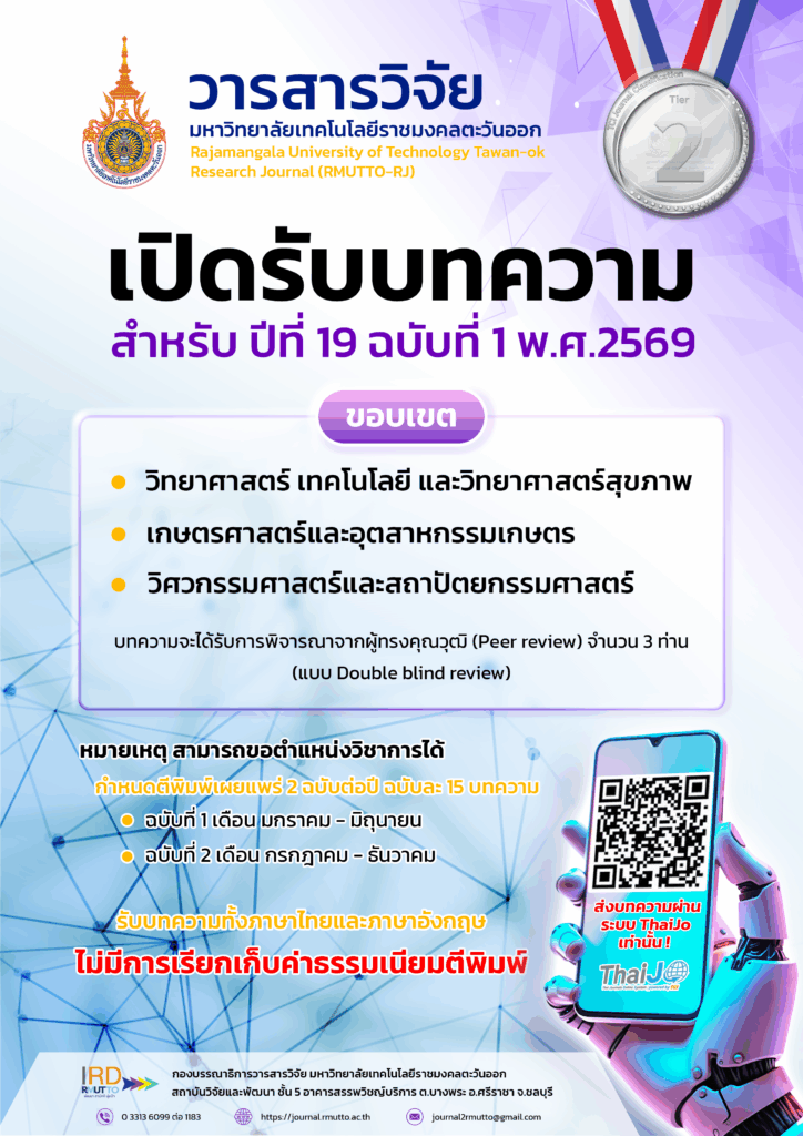 กองบรรณาธิการวารสารวิจัย มหาวิทยาลัยเทคโนโลยีราชมงคลตะวันออก ขอประชาสัมพันธ์และเชิญชวนคณาจารย์ นักวิจัย และนักศึกษา ทุกท่าน ร่วมส่งบทความวิจัยหรือบทความวิชาการ เพื่อเข้ารับการพิจารณาตีพิมพ์ในปีที่ 19 ฉบับที่ 1 เดือนมกราคม-มิถุนายน 2569 (ไม่มีค่าธรรมเนียมตีพิมพ์) ซึ่งสามารถส่งบทความผ่านระบบวารสารออนไลน์ (Online Submission) ได้ที่ https://li01.tci-thaijo.org/index.php/researchjournal2rmutto